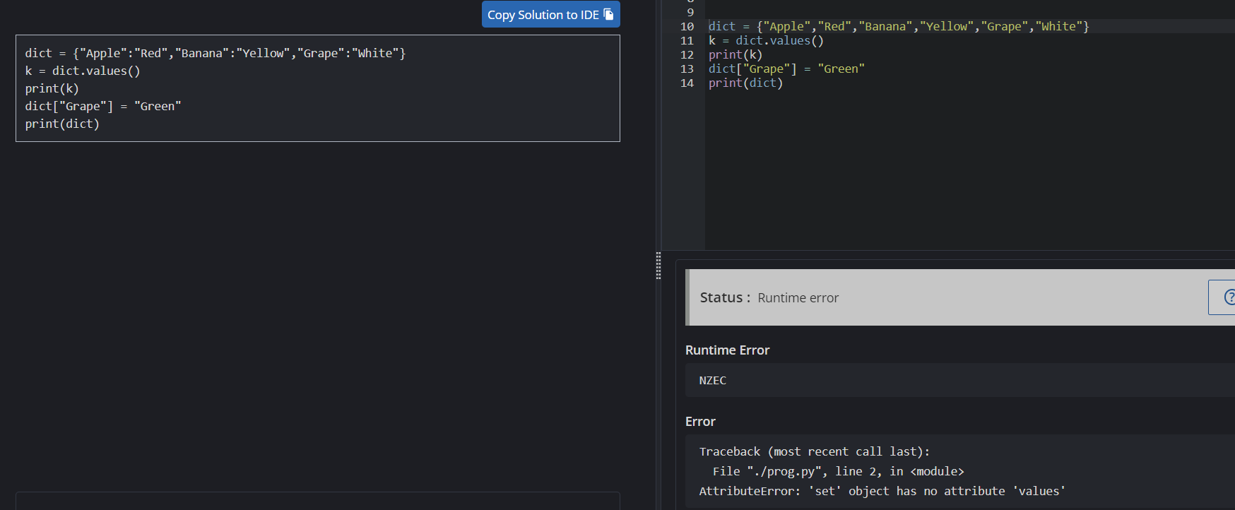 dict is a dictionary, there is a different between your code and solution. You are putting values comma separated, but in dictionary we have (key, value) pair, denoted like this {"Apple": "Red"}.