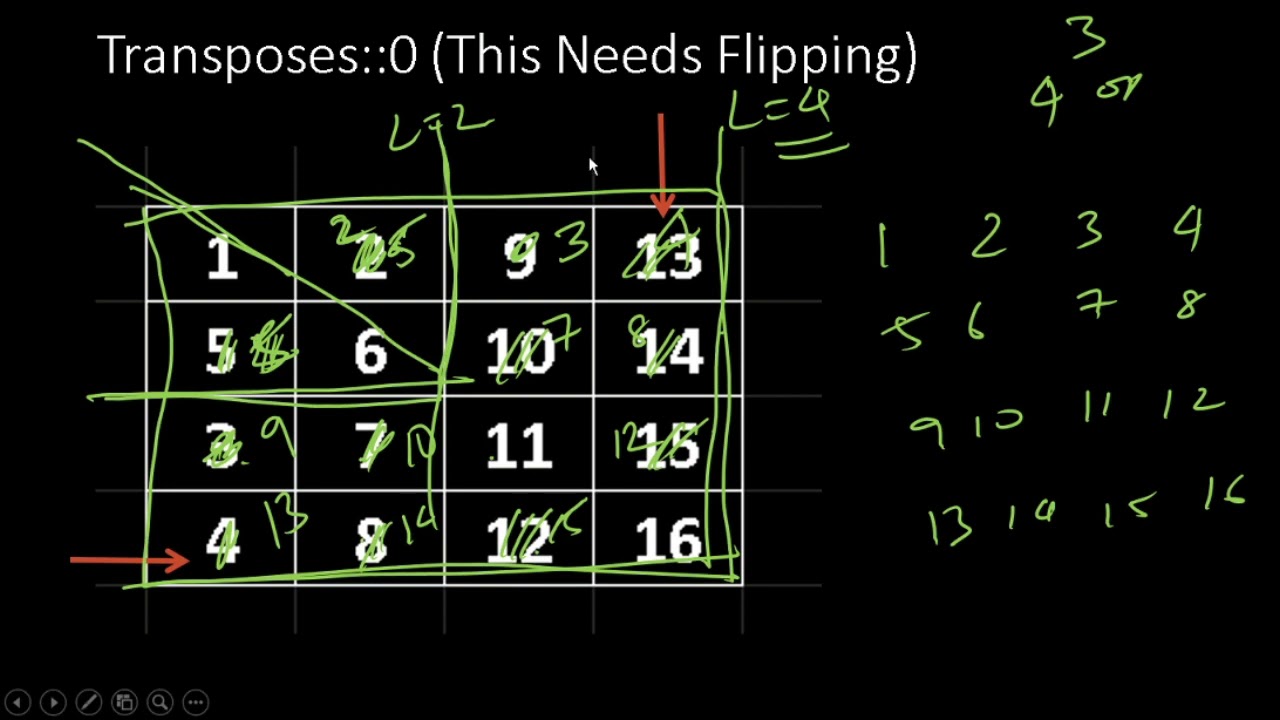 Let’s construct a binary array B, where B_i=1 iff the number of transpositions with X \geq i must be even. We can get B by iterating over the matrix and finding the elements that need to be swapped with their symmetrical.
