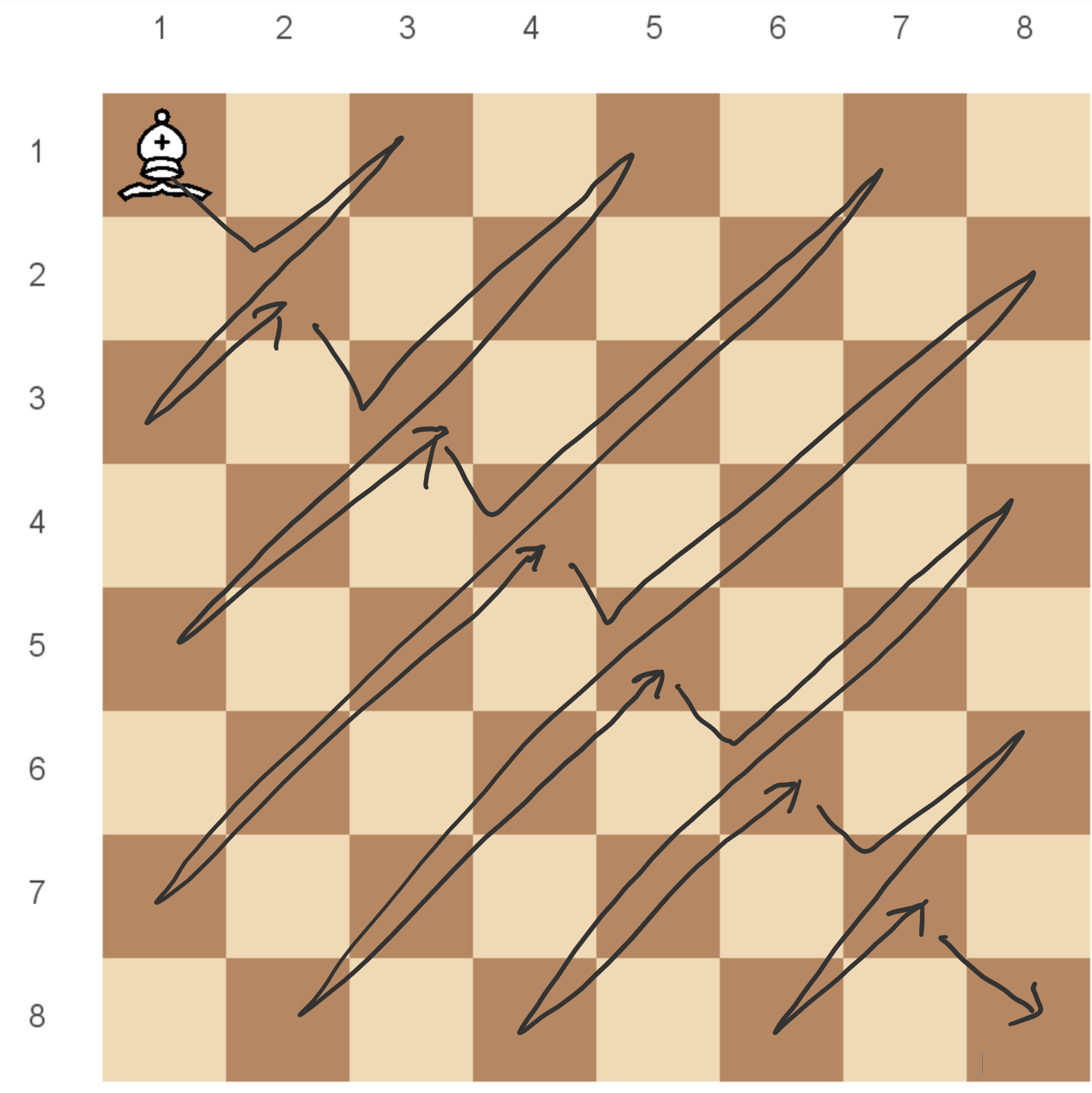 Let’s solve the first subtask first. The bishop starts at (1, 1). Our plan is to cover the diagonals one by one: