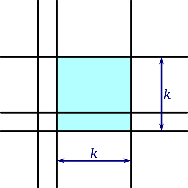 Now we have two boolean arrays verDiff and horDiff that hold whether the vertical or horizontal lines would allow a square of size k to exist. If we want to count the number of different sized squares we loop trough both arrays and count how often verDiff[k] = horDiff[k] = true. But we can still add a line to increase the number of squares.