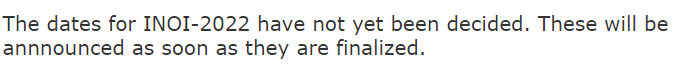 Does anyone know an approximate date for INOI-2022? I am asking bcoz this year I will be having an exam (with customizable date) and I would prefer their dates don’t crash (If INOI & my test date crashes, I’ll set my test date to some other day).