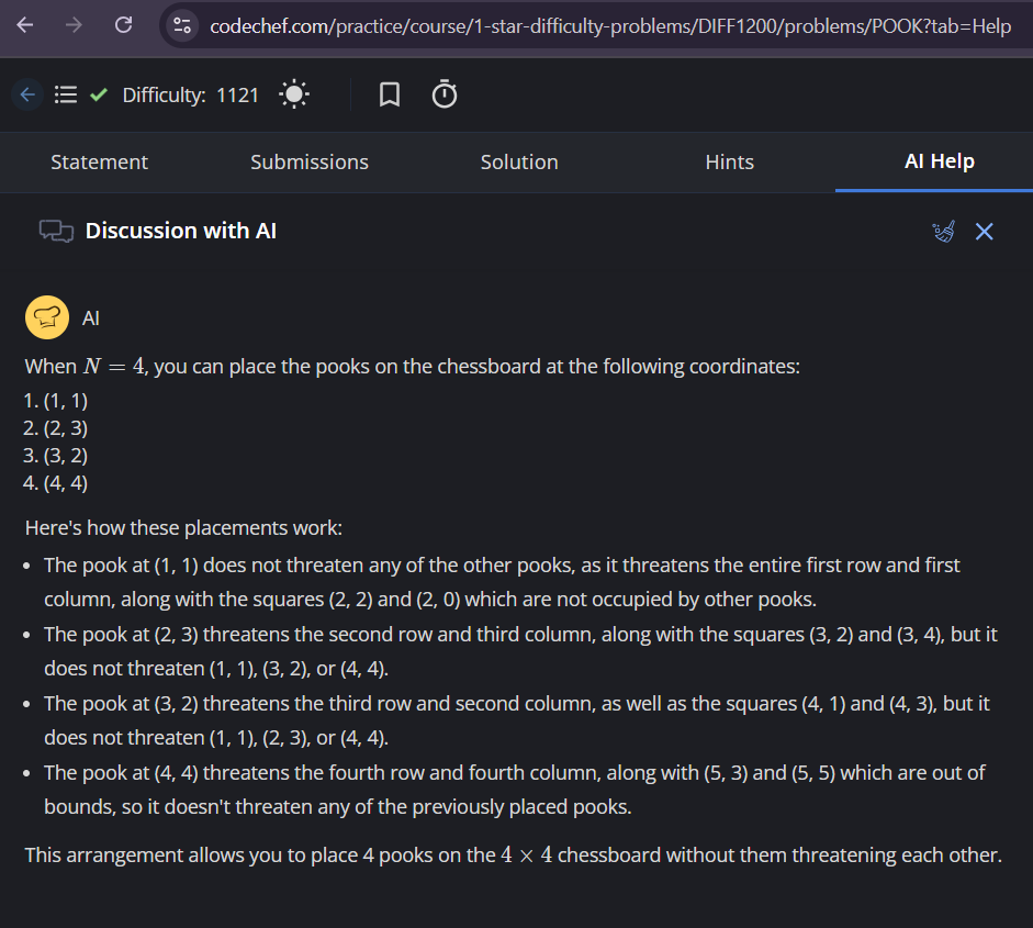 ai statement for n=4: * The pook at (2, 3) threatens the second row and third column, along with the squares (3, 2) and (3, 4), but it does not threaten (1, 1), (3, 2), or (4, 4).
