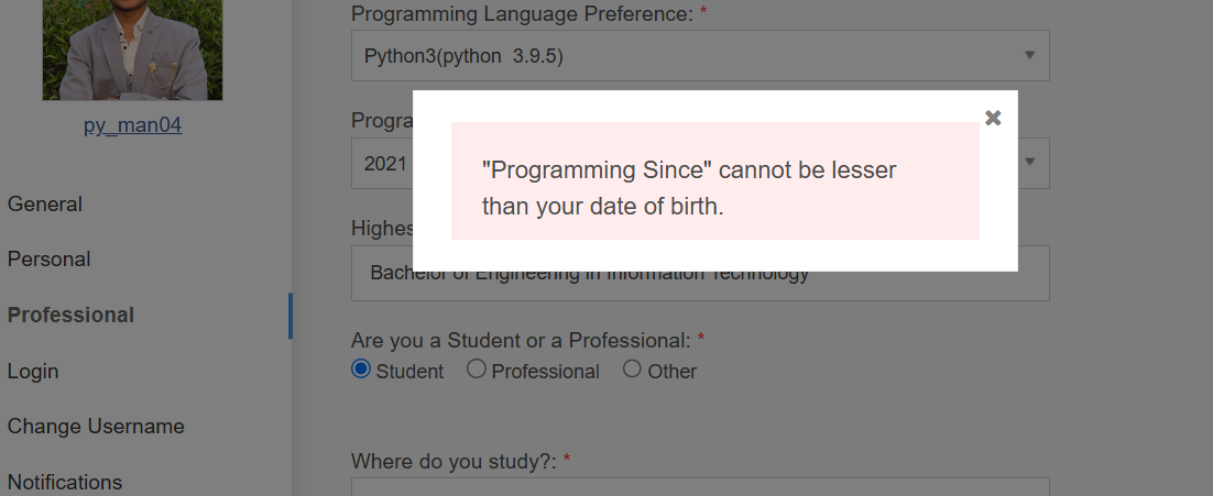 It’s not that big issue but I recently see that in my Professional Information page, there is a selector Programming Since, here when I entered any year it gives me a pop-up , which I sent a screenshot. please look at that.