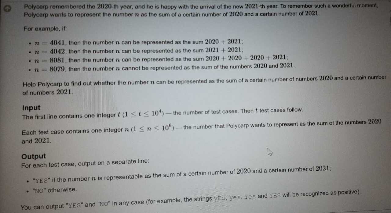 Run a loop of y from 1 to floor(N/2021) and check if any integer solution of x exists.