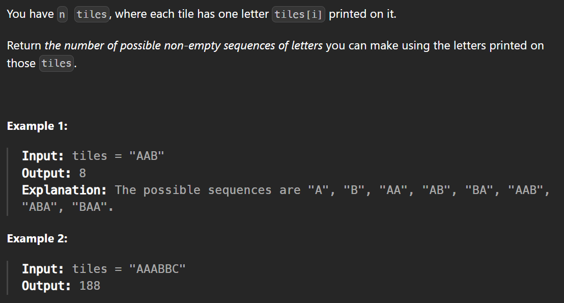 You have n tiles, where each tile has one letter tiles[i] printed on it.