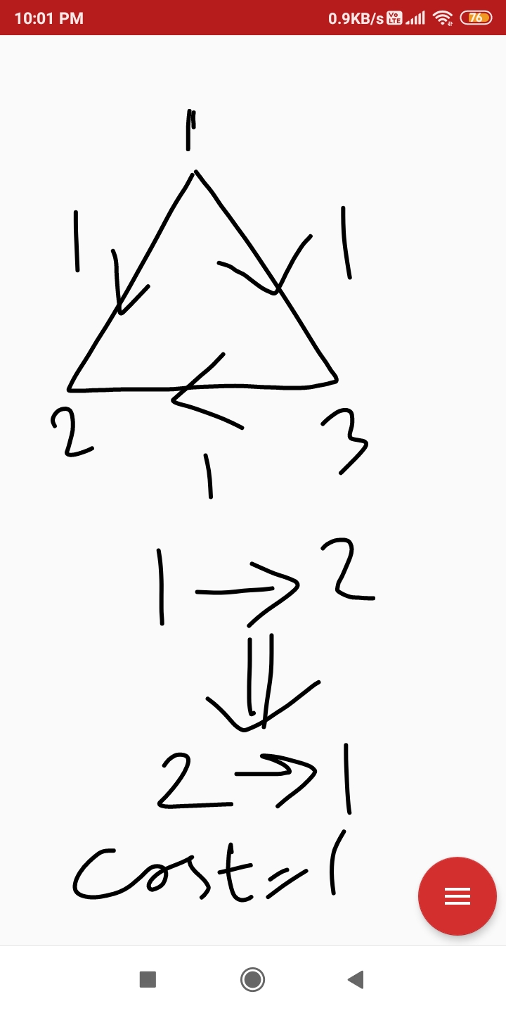 Okay, so for 2nd test case, path was from 1–>2, 1–>3 and 3–>2. To make it a cycle,with min cost, we are reversing the array of 2—>3 and 1–>3 right, so min cost is 2