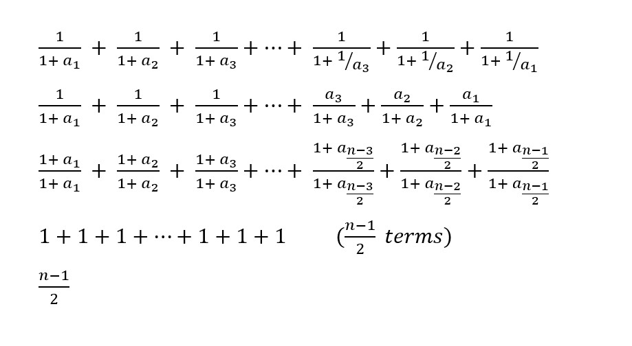 In this case, the value of n - 2i ranges from n-2, n-4, n-6, n-8, … when i = 1, 2, 3, 4, … to …5, 3, 1, -1, 3, 5, … when i = …(n-3)/2, (n-1)/2, (n+1)/2, (n+3)/2, … to finally …8-n, 6-n, 4-n, 2-n when i = …n-4, n-3, n-2, n-1. Thus, we can observe that the exponents in the first half (first (n-1)/2 terms) are the negative of those in the second half (second (n-1)/2 terms) and vice versa. Thus, a series (as was to be calculated in the question) of the following form is formed
