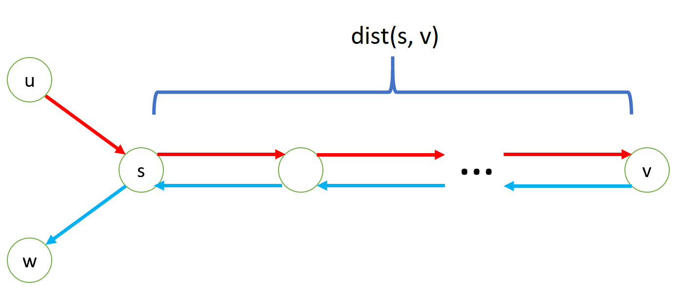 The other vertices form several branches hanging from split vertices. Let v be a vertex on some branch and let \text{dist}(s, v) be the distance between vertex v and the nearest split vertex s. Consider the split vertex s nearest to it. Let u, w be any two vertices adjacent to s that do not lie on the path from s to v. Then, the path we will take is u \rightarrow s \rightarrow \dots \rightarrow v \rightarrow \dots \rightarrow s \rightarrow w (see Figure 2). Regardless of u and w, you must move from s to v and back to s. You must exit s before the ghost reaches s. Hence, vertex v is only reachable if 2 \cdot \text{dist}(s, v) < K. A branch with length d excluding the split vertex would therefore contribute \min(d, \lfloor \frac{k - 1}{2} \rfloor) to the answer.