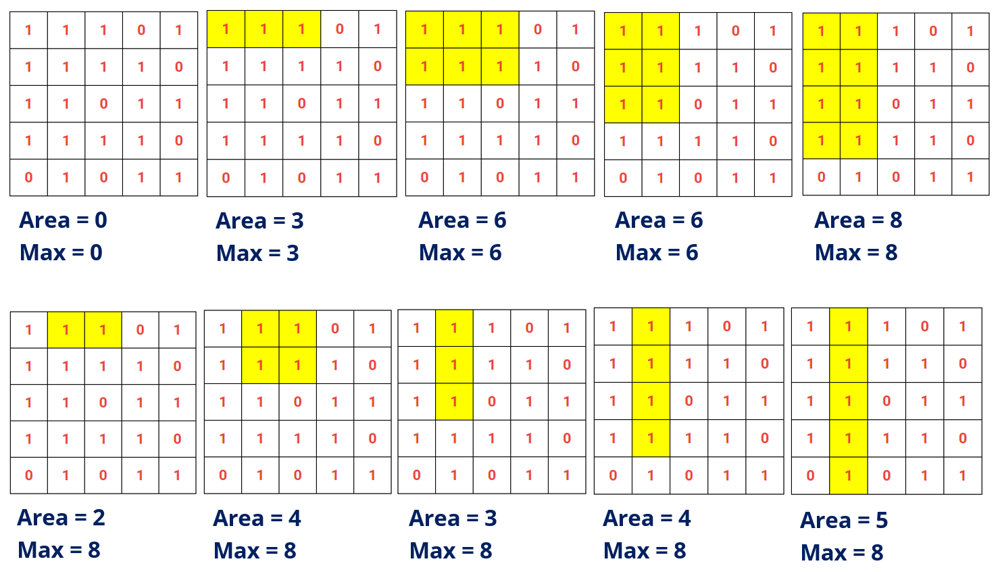 i+1th row and find maximum column length of 1s starting fromM[i+1][j]. Take minimum of all lengths and find the area and keep updating max area. - Continue similar process till you reach last row and then repeat the process for all other cells as well.
