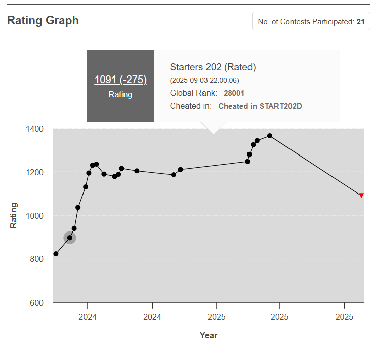 I have been giving codechef contests for more than one year successfully attempted more than 20 contests and when i was about to hit a milestone these guys dropped my rating by 275 by saying i cheated but ik that i didn’t cheat then why they did this to me idk anyone is gonna trust me or not but ik that i didn’t cheat even in a single contest. And after so much determination what i got a milestone of being called as a cheater without any fault. This thing totally broke me from inside quitting this shit platform from today itself. Bye bye codechef may god give a damn fuck to your team member who tagged me as a cheater.