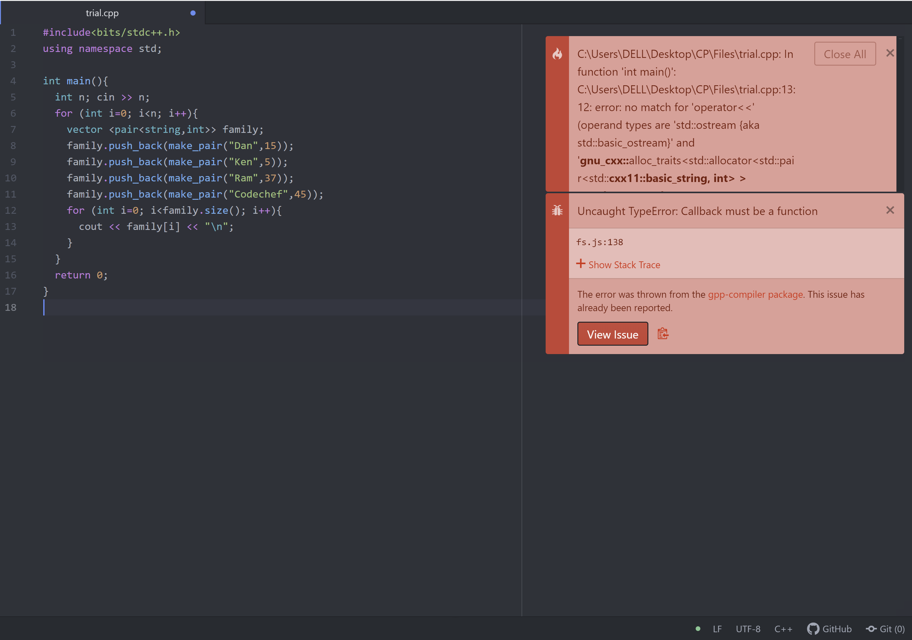 I think it is fully fine but Atom is showing error when I try to run it. Can someone tell me where I have made a mistake ?
