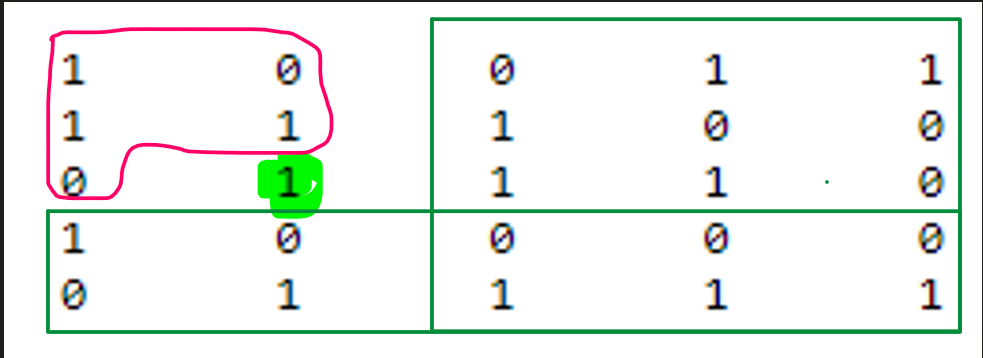 In basic terms, I’m simply recursively traversing the entire matrix. If the current submatrix has only 0’s or only 1’s, I exit the current iteration. Else I split into two halves and go deeper.