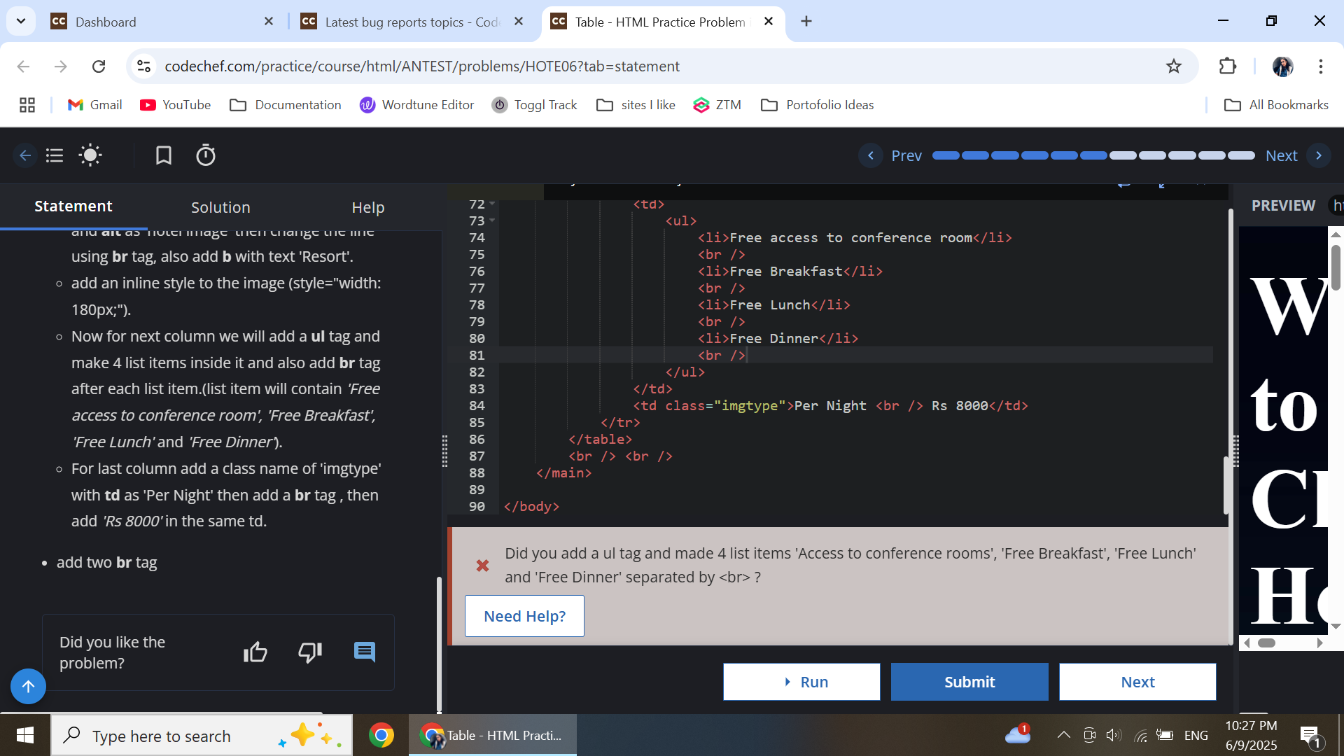 - then add an image tag inside td use image src (I didn’t copy-paste the img link here because it didn’t let me) and alt as ‘hotel image’ then change the line using br tag, also add b with text ‘Resort’.