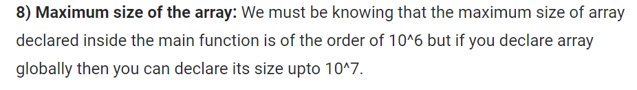 Maximum size of the array: We must be knowing that the maximum size of array declared inside the main function is of the order of 10^6 but if you declare array globally then you can declare its size upto 10^7