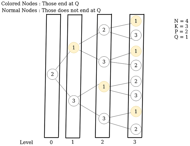 b) For B[i-1]*(K – 2) , rest of the non favourable nodes are produced by non favourable nodes of previous level, multiply by (K-2) , as one produced node is favourable, so we subtract 2 from this.