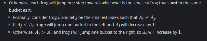 - Otherwise, each frog will jump one step towards whichever frog is the smallest-numbered one in a different bucket from it.