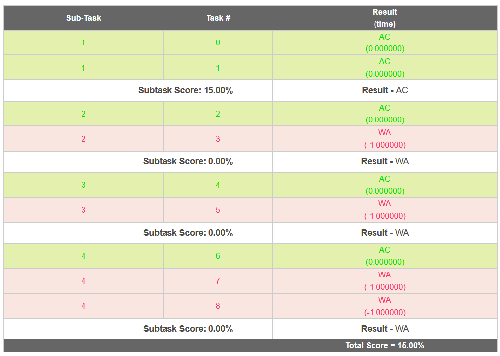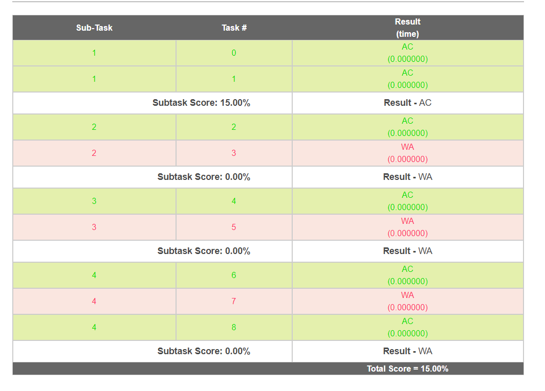 Can anyone please tell me why did i get 15 points only as some of the tasks of subtasks 2 and 3 have an AC.