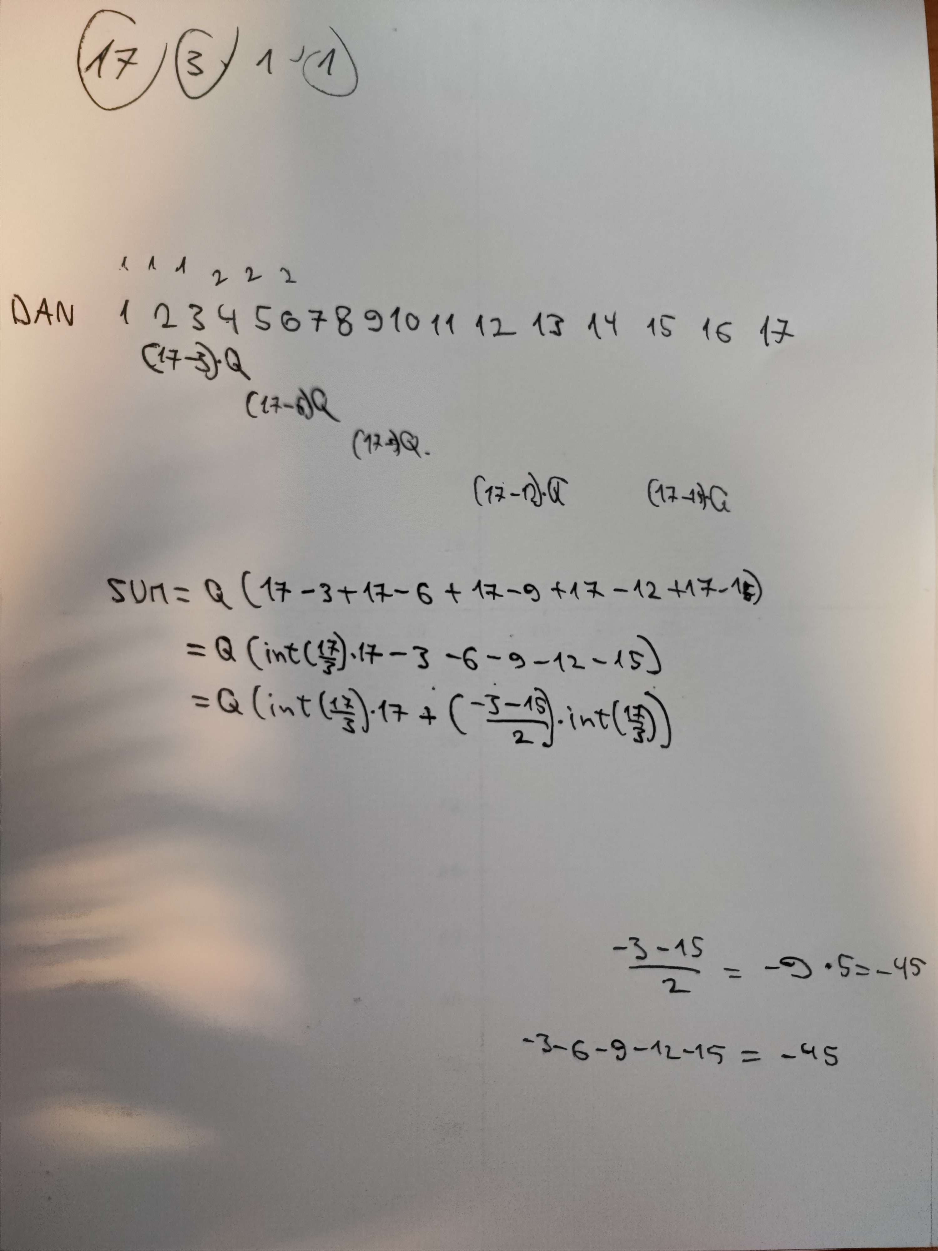 cumulativeSum = Q * ((D//d) * 17 + (D//d) * (-3 - 15)/2)
