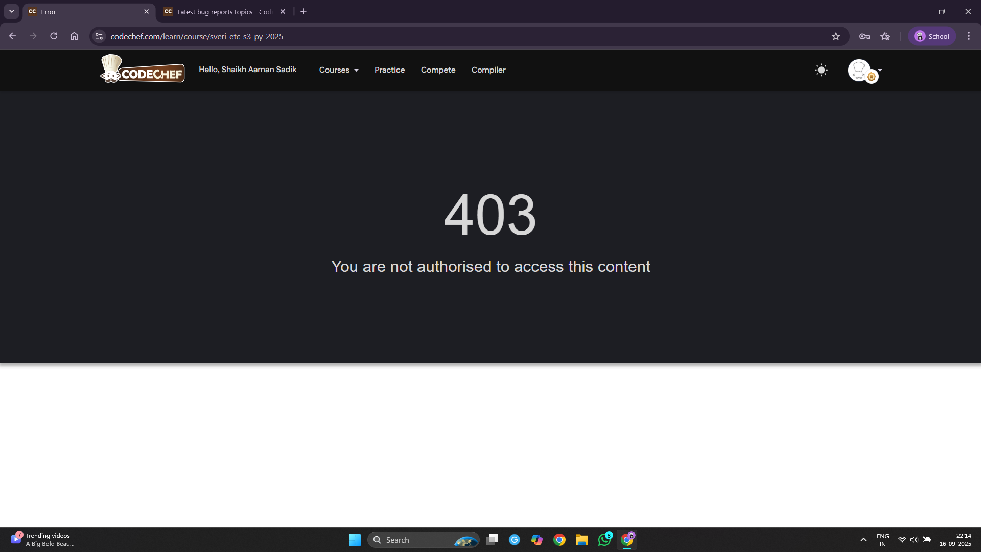 Hello CodeChef, I am student of SVERI COEP, Pandharpur. I recently started python with oops course, I completed almost 20% of the course.