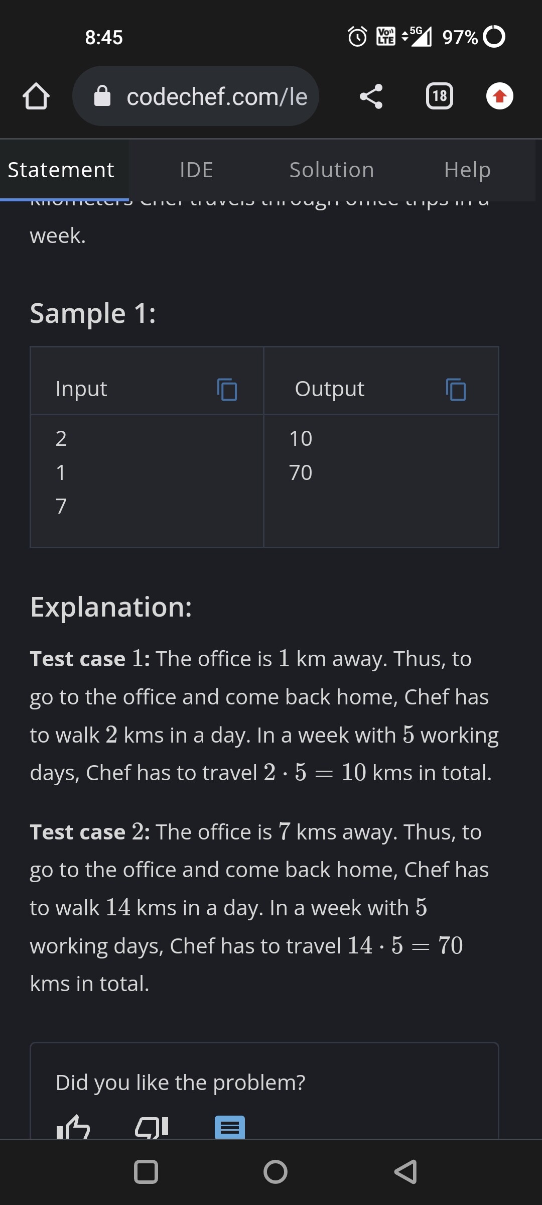 The given sample inputs are the distance from home to office. This changes for each test case. But the number of working days in a week is constant which is 5.