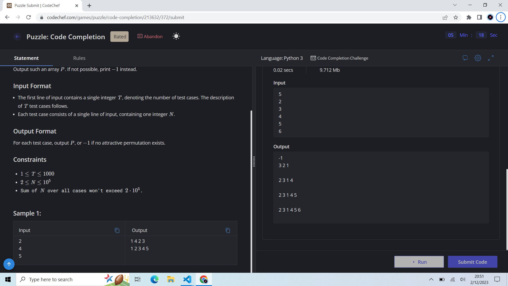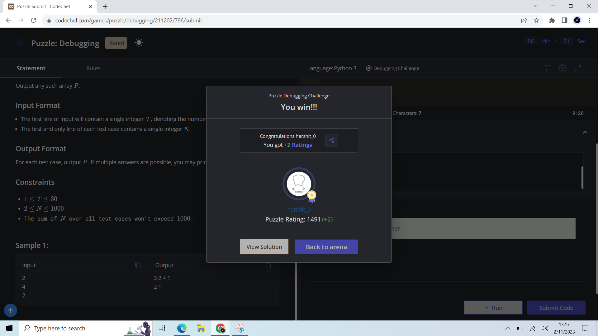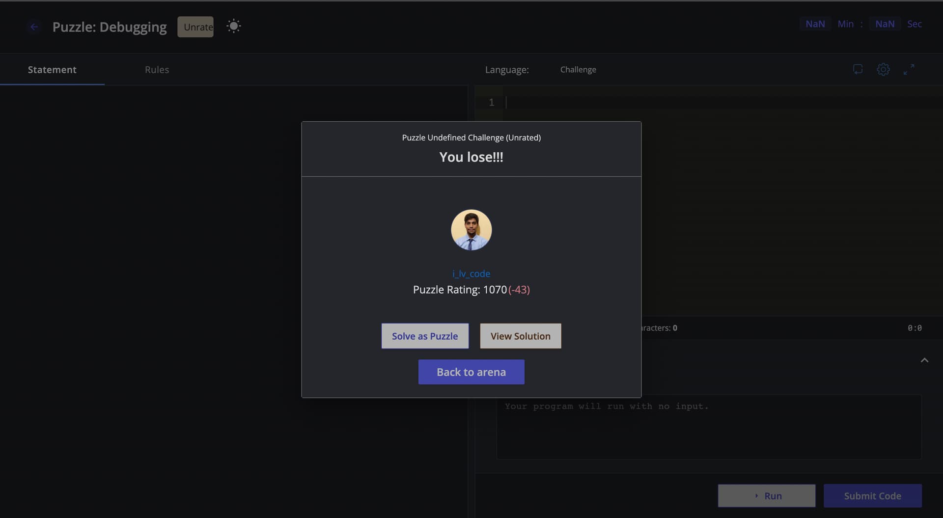 I encountered a technical issue while attempting to solve a debugging puzzle. Specifically, I attempted to solve a debugging puzzle but encountered an unexpected error that caused the puzzle to become unrated. In my first attempt, I abandoned the problem due to the error, but unfortunately, I lost my rating.