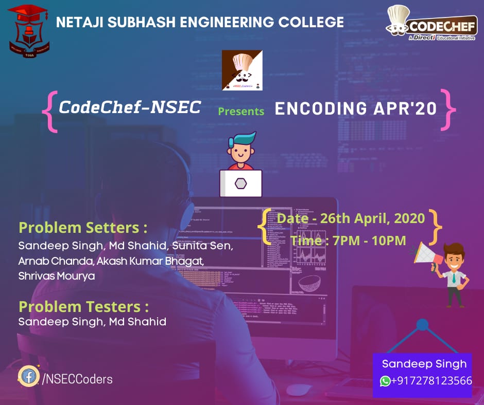 Encoding is a monthly contest hosted by CodeChef-NSEC. This is a 3hr long coding contest based on algorithms and data structures and aims to encourage participants to apply their knowledge towards problem-solving.