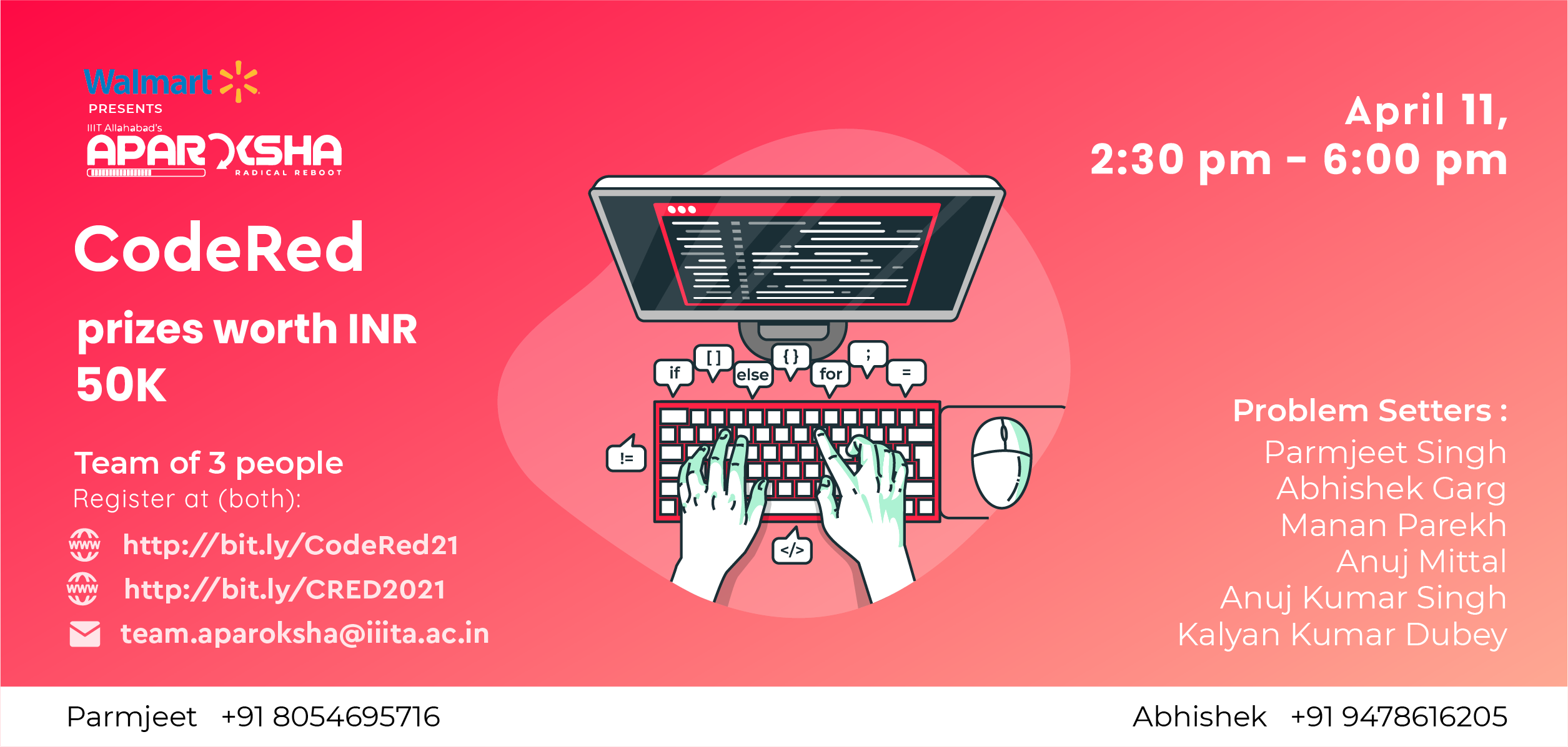 CodeRed, Alkhwarizm (Rated for all CodeChef contest), and Humblefool cup (which happened on April 9th on Topcoder) are all among the flagship coding events of Aparoksha — Techincal fest of Indian Institute of Information Technology (IIIT), Allahabad.