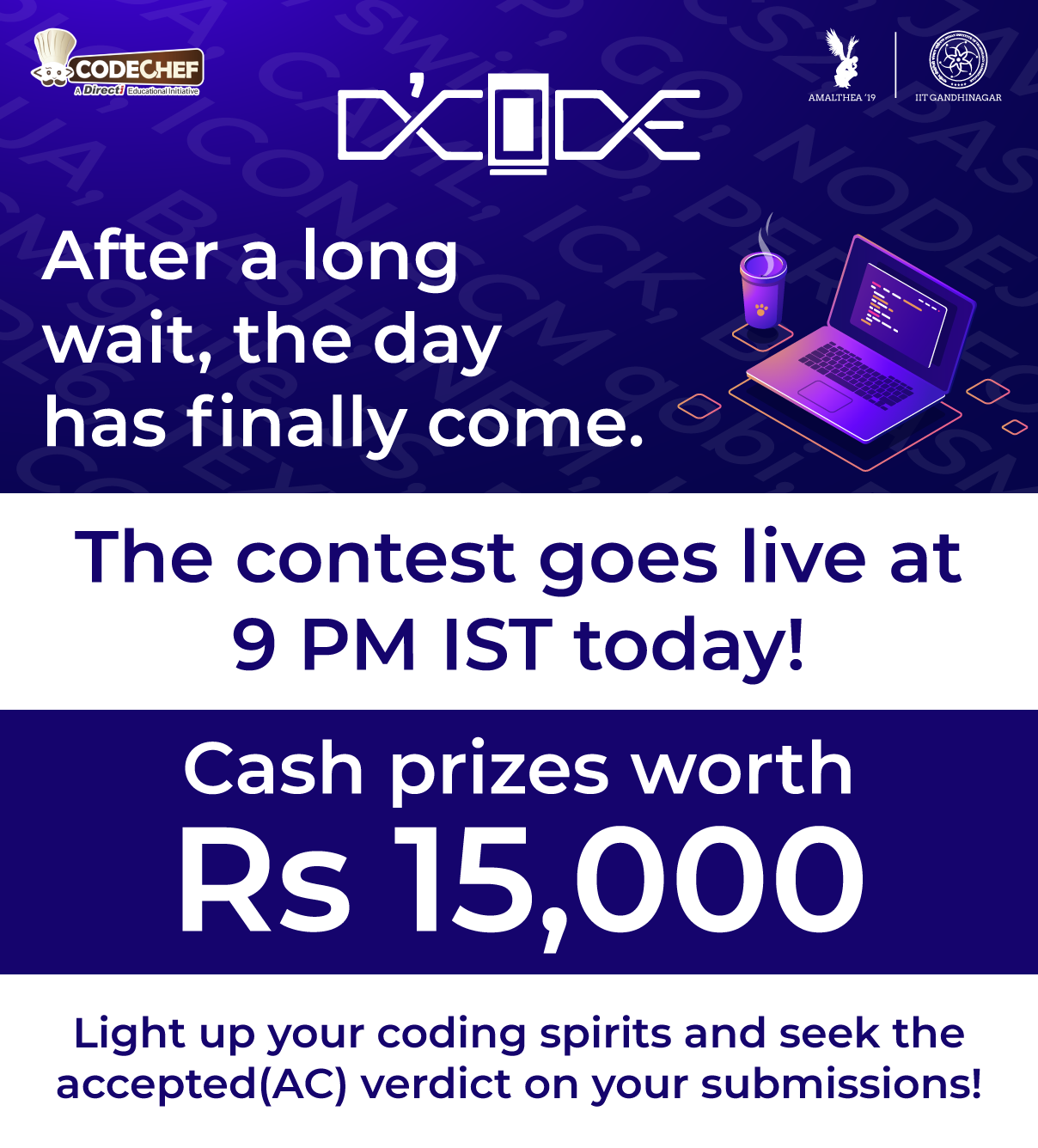 I would like to invite you all to participate in D’code by Amalthea, IIT Gandhinagar. The contest will be 3 hours long and will contain 7 problems.