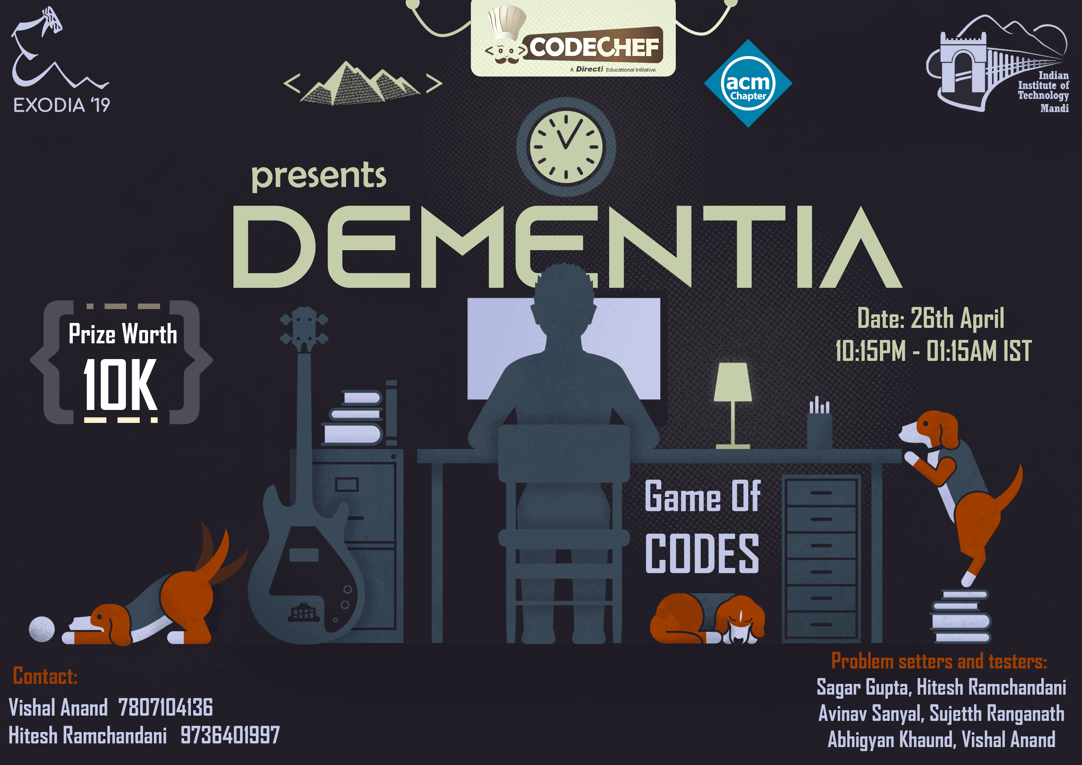 Programming Club, Indian Institute of Technology, Mandi is organizing Dementia 2019 as part of our cultural-cum-technical fest Exodia. The contest will take place on 26th April 2019 at 22:15 IST (16:45 UTC).