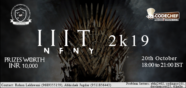 We invite all the coding enthusiasts around here to show off your coding skills and solve challenging problems in the biggest coding event of Indian Institute of Information Technology, Pune , InfInITy 2k19. Get ready for 3hrs of problem solving and win great prizes.
