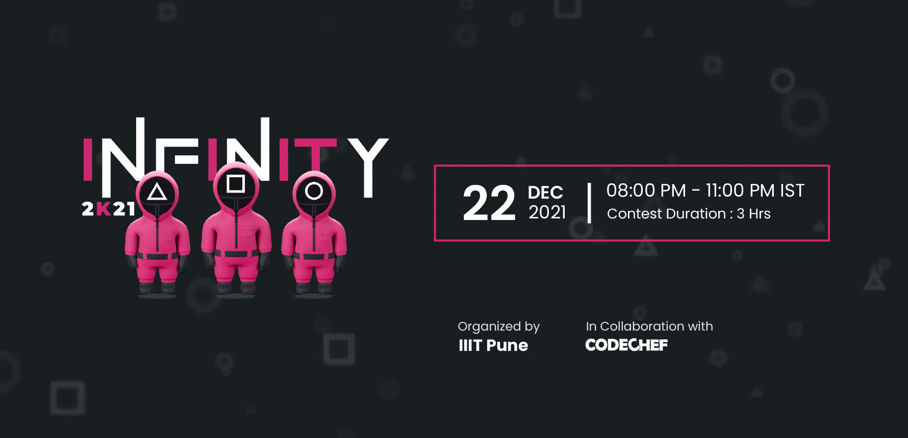 I, on behalf of the InfInITy Team, would like to invite you to take part in the 5th edition of IIIT Pune’s flagship coding event InfInITy 2k21, a rated contest hosted by CodeChef IIITP Chapter, which will take place on Wednesday, December 22, 2021, at 20:00 ISTUTC+5.5. It is a 3 hr long contest.