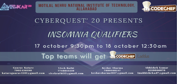 Computer Club, MNNIT Allahabad, India is glad to invite you to the annual programming competition of MNNIT, ɪɴᴤᴏᴍɴɪᴀ, which is an ACM-ICPC style team programming contest of 3 hours duration held on CodeChef during its annual technical fest Avishkar. The team can consist up to 3 members.