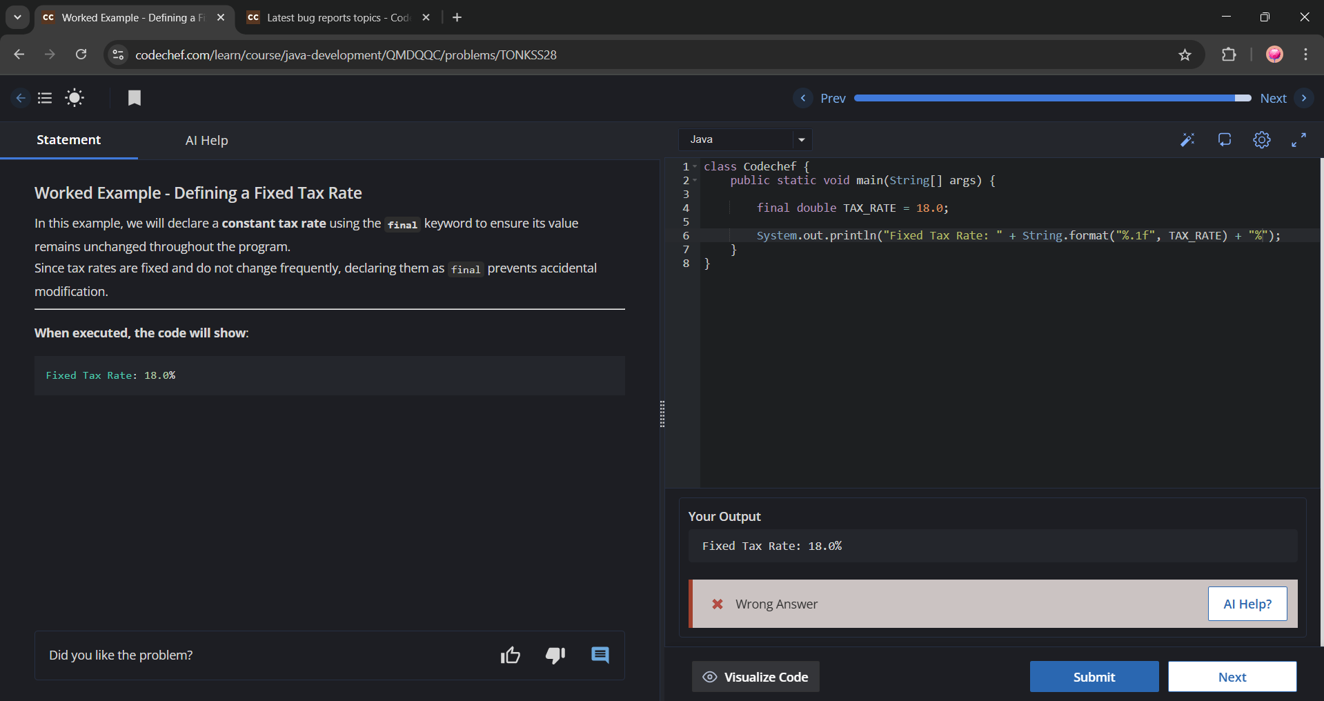 I am on Learn Java trackpath, my submission is failing even though it matches with expected output. I have also asked the AI chatbot, it is also suggesting same solution.