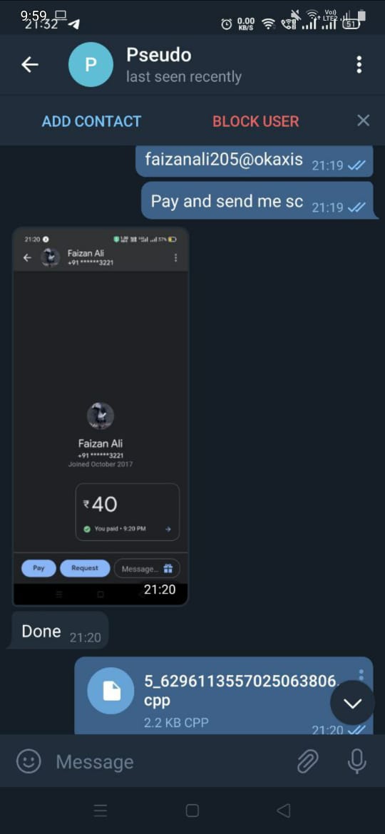 I have no interest in faking my code like by coping from telegram i wont do that but i heard news that long challenges solutions are being sold so out of curious i contacted a person in telegram unfortunately he got caught i got his CODECHEF ID:) .