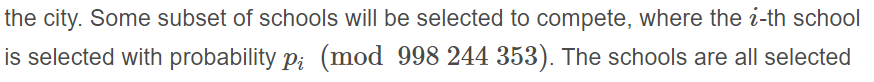 Find the expected number of ways the teams can be formed. Probabilities are given modulo M = 998244353, and find the answer mod M.