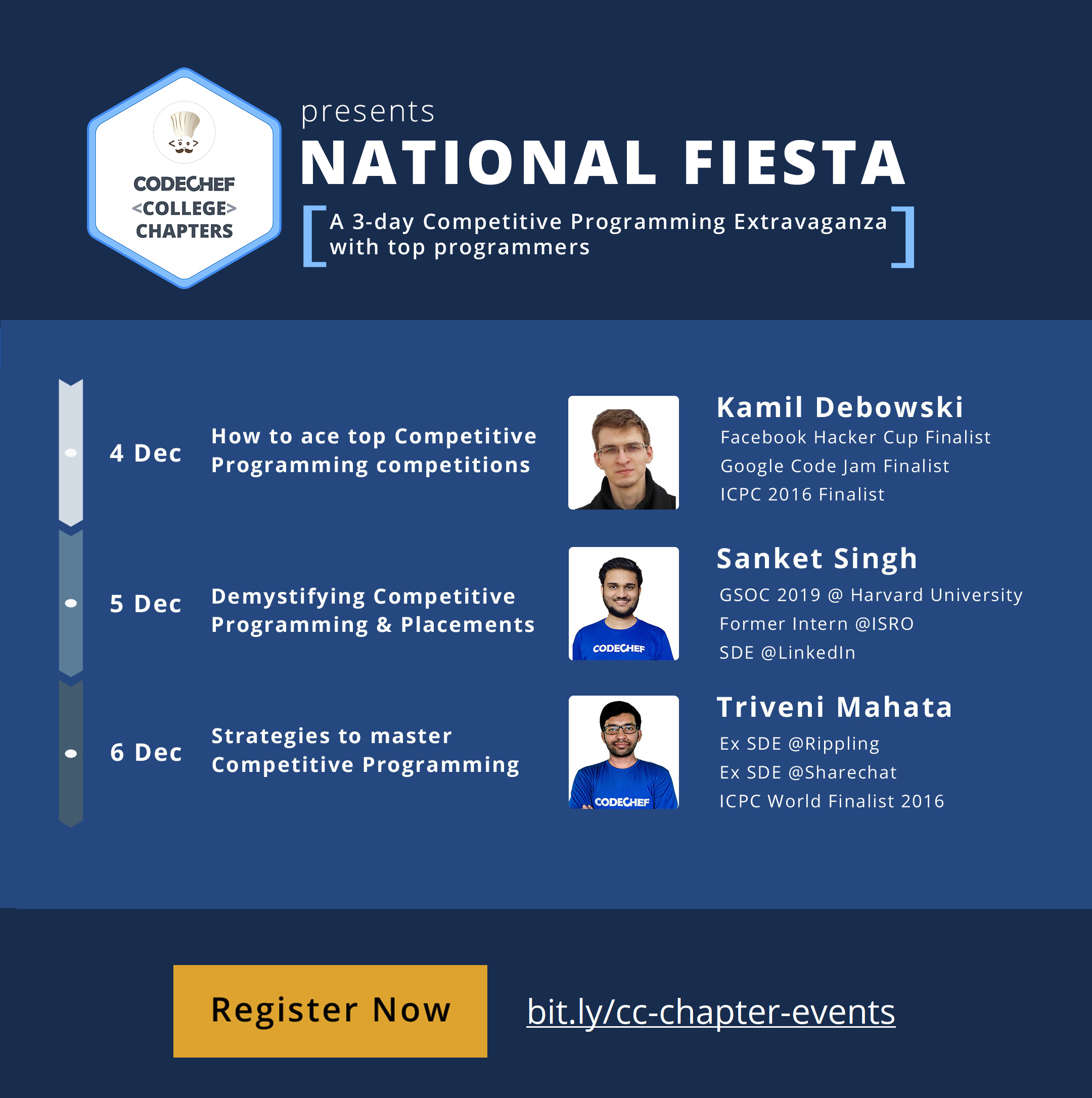 CodeChef College Chapters is excited to announce another learning opportunity and its first ever 3-Day CP Extravaganza - the National Fiesta starting from 4th December 2020 for all the community members.