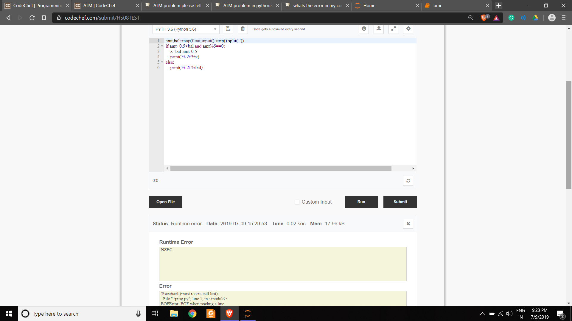 I was solving the ATM problem in Python 3.6 and was stuck because of NZEC error. I tried a few solutions, but none of them worked(I used to run those solutions and get NZEC error).