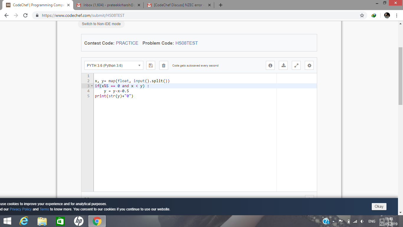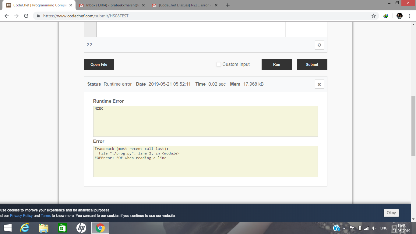 HI, the IDLE is throwing NZEC error on the first line even simple statement is trowing NZEC error but on running with custom inputs the code is working fine . Can anyone help me with this error.