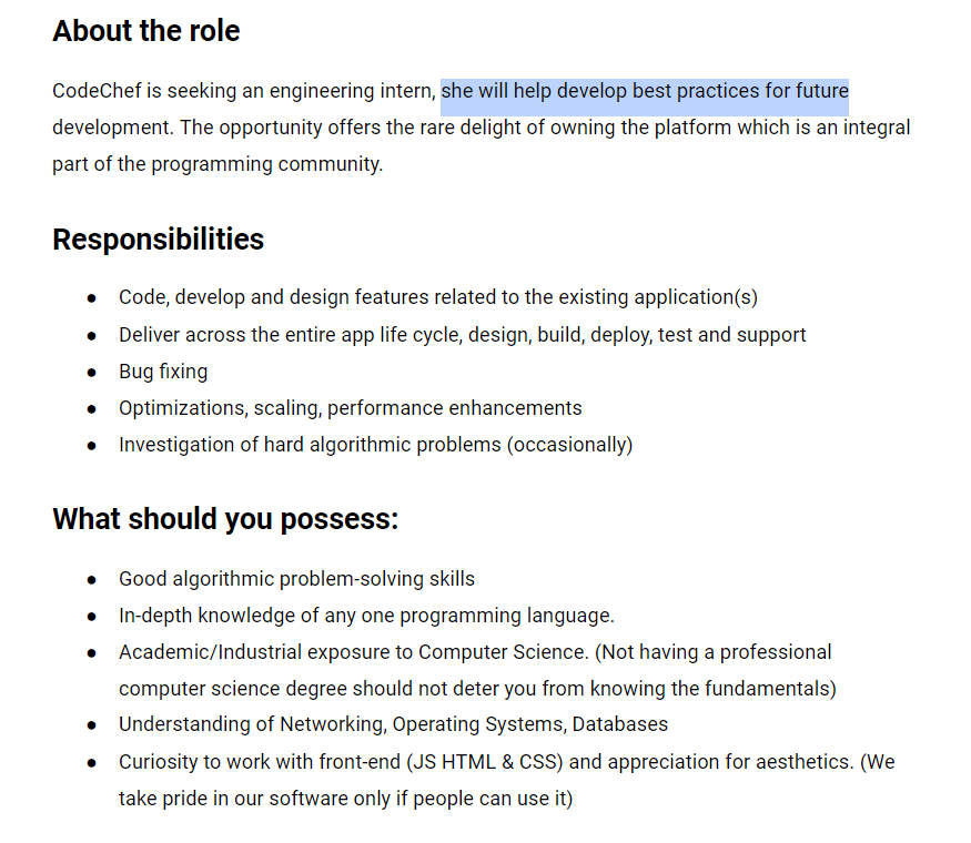 How exactly does “she” mean gender neutral tho ? the post is 9 years old and if codechef follows that , maybe we do not want to work for such a misandry organization either.