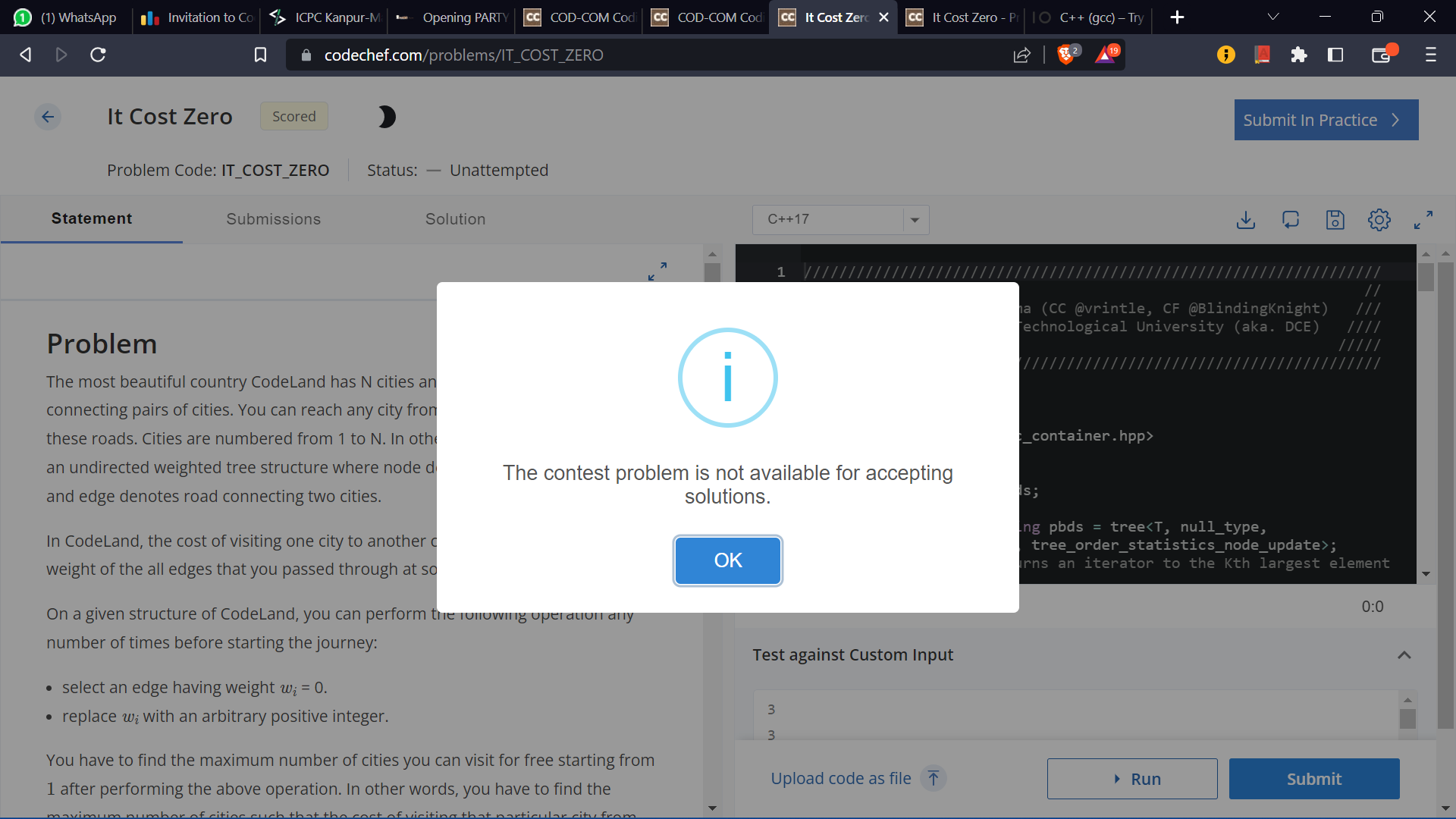 The Problem PARTY_AT_OPT from today’s COD-COM Online Round is not allowing submissions. When I click “Submit In Practice”, it either leads to a 404 error, or the site freezes.