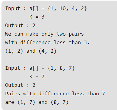 Given an array of n integers, We need to find all pairs with difference less than k