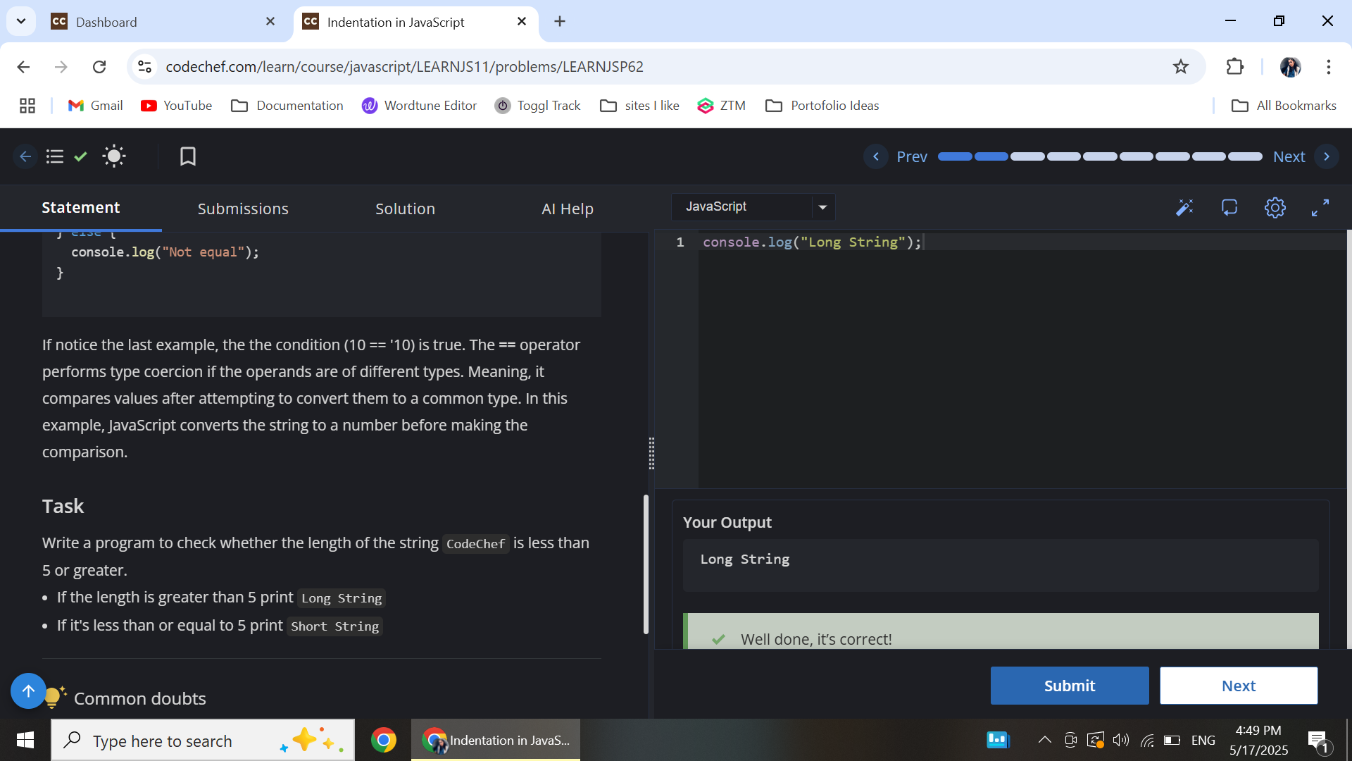 I wanted to report a potential issue I encountered while using the CodeChef IDE for a beginner-level problem. The task was to check whether the length of the string "CodeChef" is less than or equal to 5 or greater than 5, and then print: