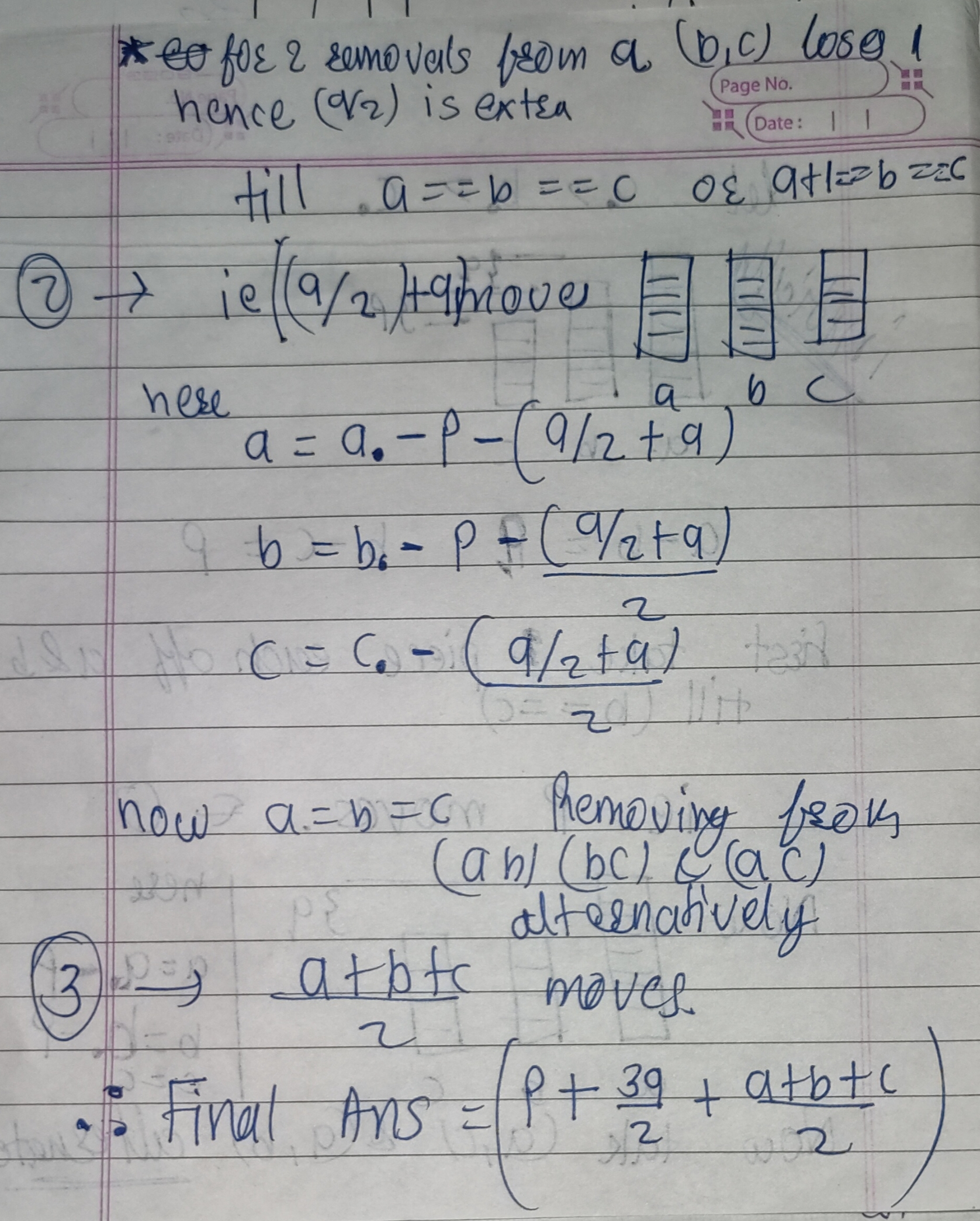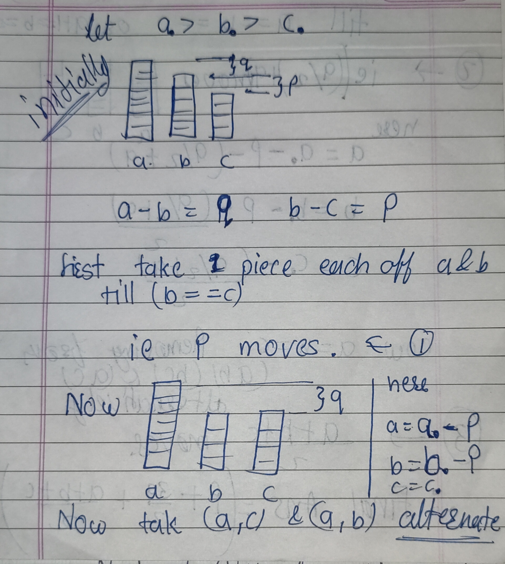 It’s a bit difficult to articulate, but the main thing is I can remove c from a and b such that the difference is at most 1. That is because we know a and b are less than c and therefore b-a is also less than c. So we can make sure that the difference doesn’t exceed 1, so we reach either 0,0,1 or 0,0,0 depending on the parity, and we can do (a+b+c)/2 moves.