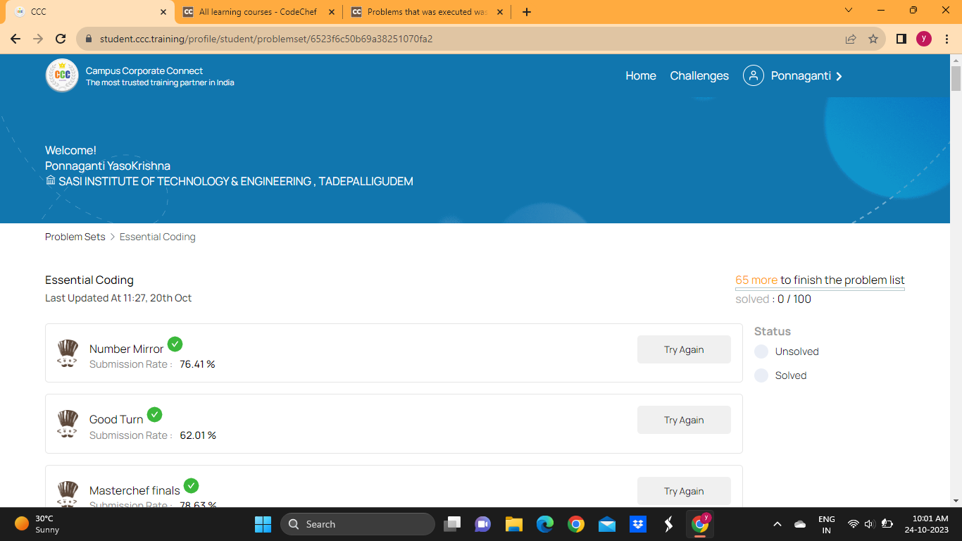 here in codechef they are submitted correctly but in ccc account provided by my college is not showing that how many i have left to solve the problems so these scrrenshots are enough for you to understand my problem so please try to find a solution for this problem and mail id is “yaso.ponnaganti@sasi.ac.in”