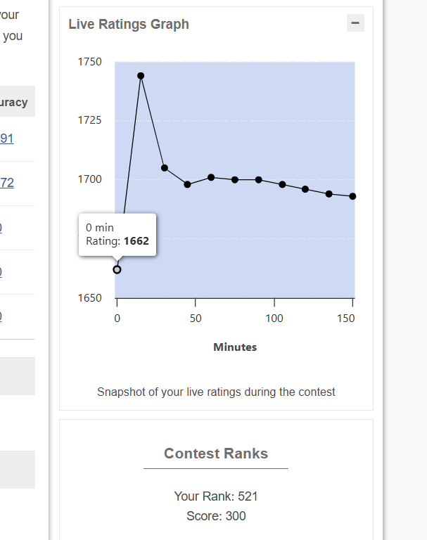 I had 1662 rating upto 179 starters and 1694 upto 180 starters, but in 181 starters my rating was calculated from 1662 again and my rating changes to 1693, because it was again considered from 1662 and not 1694