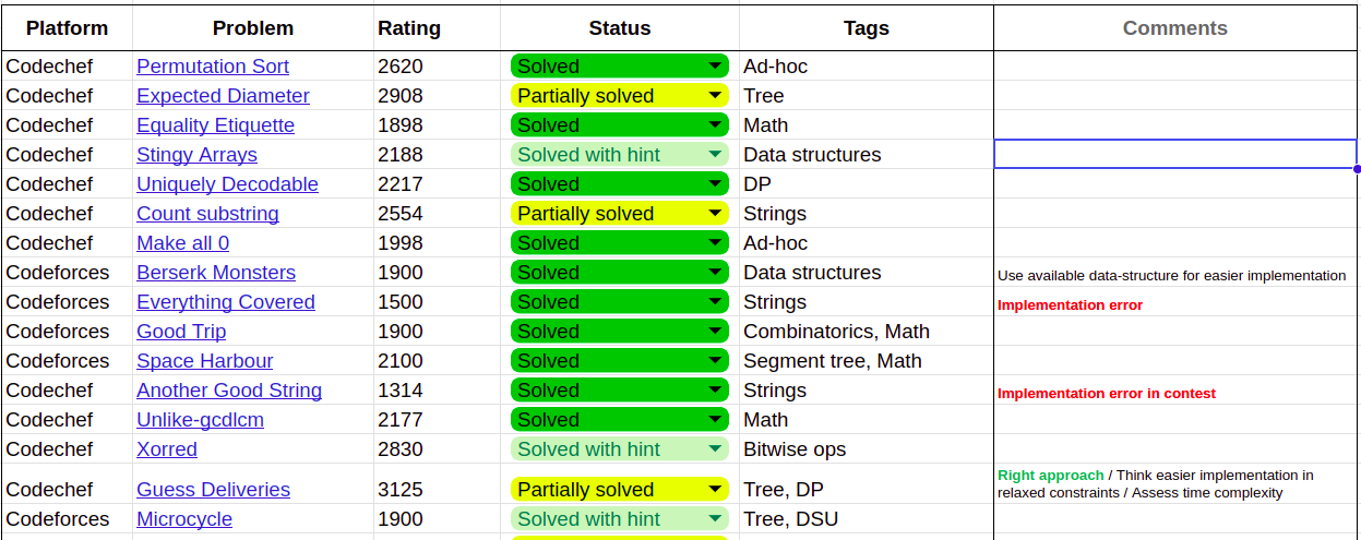 I have recently been experiencing a surge in ratings. This is not a post to proclaim this but lately, I have been more methodical in the way I approach competitive programming. Specifically, I have been maintaining an excel sheet to track the contest problems and practice problems I solve. It contains the fields of platform (Codechef/Codeforces for me), problem link, difficulty level, the status of my solving (Solved, Solved with hint, Partially solved, unsolved) and optional comments. Comments may be regarding scope of improvement (speed, constraints, DS/algo to improve on).