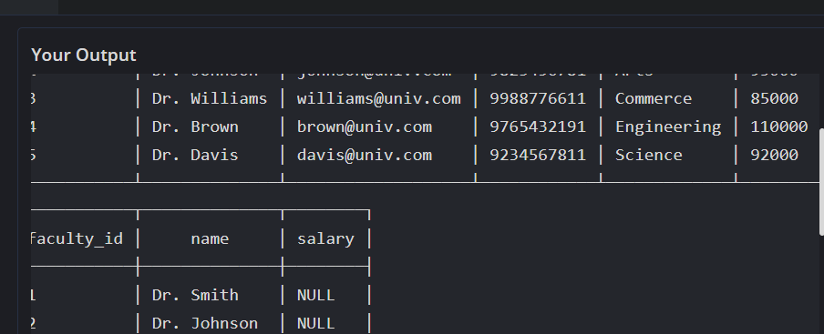 "Hello, I’m encountering an issue with this problem. According to the problem description, ROLLBACK TO S1 should restore the original salaries of the faculty members. However, when I execute ROLLBACK TO S1; followed by SELECT * FROM Faculty;, the salary column contains NULL values for all rows. This indicates that the S1 savepoint was created before(it was mentioned in the previous query) the salary data was populated in the Faculty table.