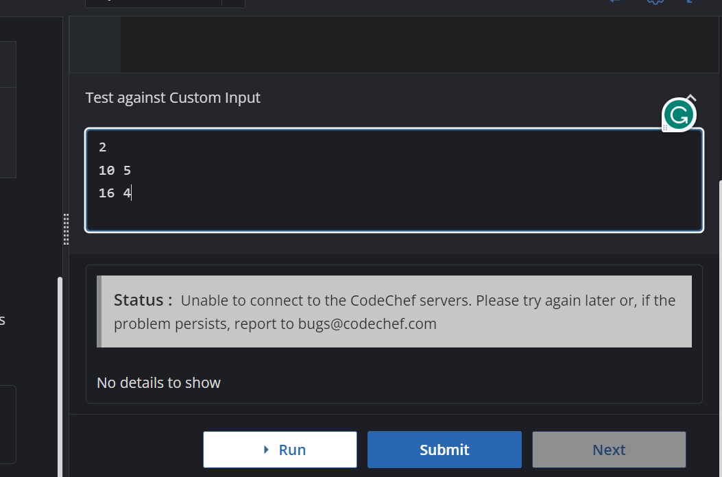 unable to connect to the CodeChef servers. Please try again later or, if the problem persists, report to