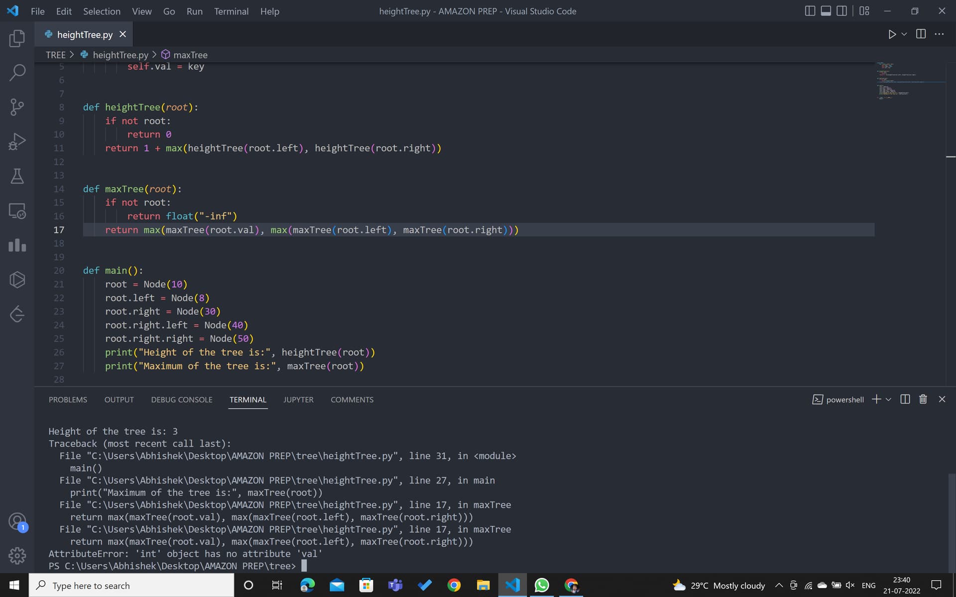 In line 17, I think you should not call maxTree(root.val) as root.val is an integer not a node.
