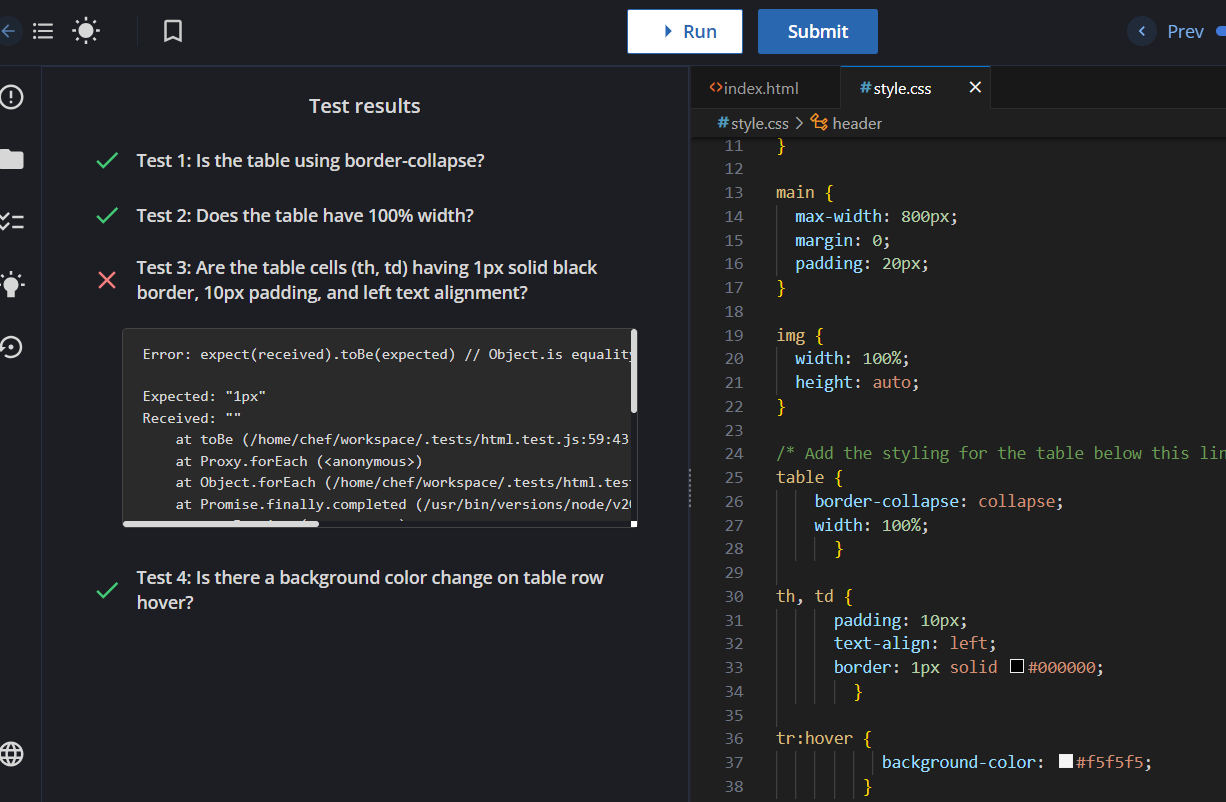 The automated test for “Are the table cells (th, td) having 1px solid black border, 10px padding, and left text alignment?” fails with an assertion showing Expected: "1px" and Received: "" (empty string), even though the stylesheet contains border: 1px solid #000000; for th, td. This results in a false negative.